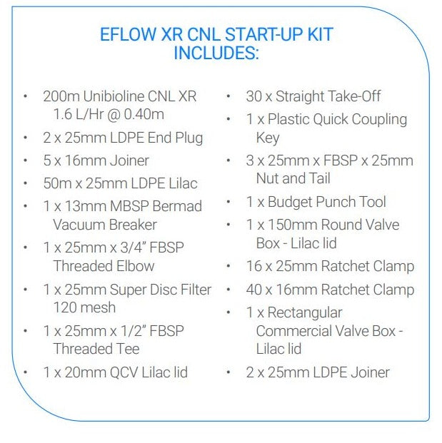 E-flow Kit Xr – Start Up Kit Netafim Waste Water Kit /dispersal System E-flow Xr Cnl Start Up Kit 1.6 L/hr @ 0.40 Spacings 200m2 42000-010165