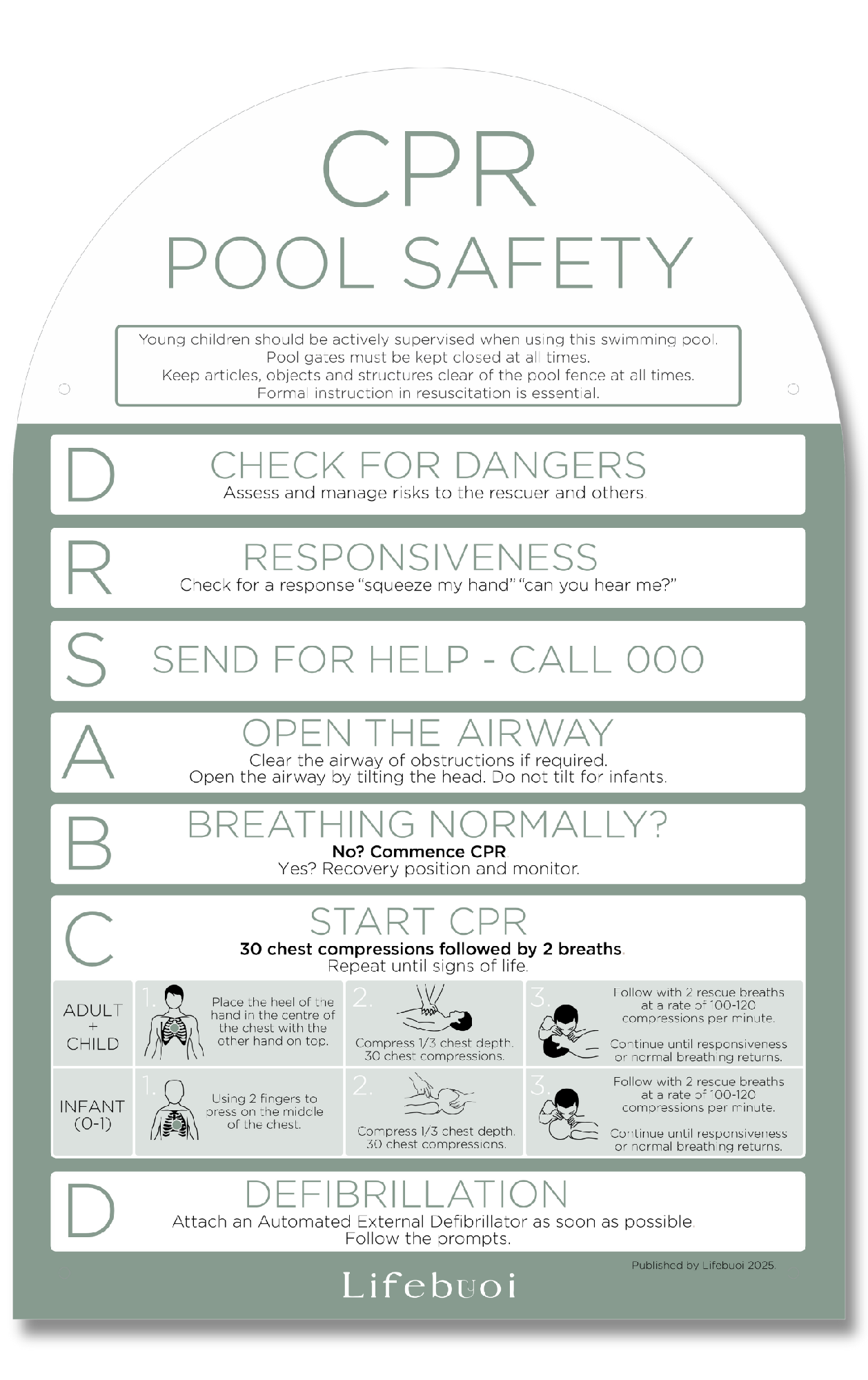 Arch CPR Sign – National Compliance Colour: EucalyptusEucalyptus is a fresh, natural colour inspired by Australia’s iconic landscapes. Its soft, muted green hue brings a calming, organic feel to any pool environment, making it the perfect choice for both contemporary and classic designs. Its subtle tone enhances your space without overwhelming it, blending seamlessly with […]